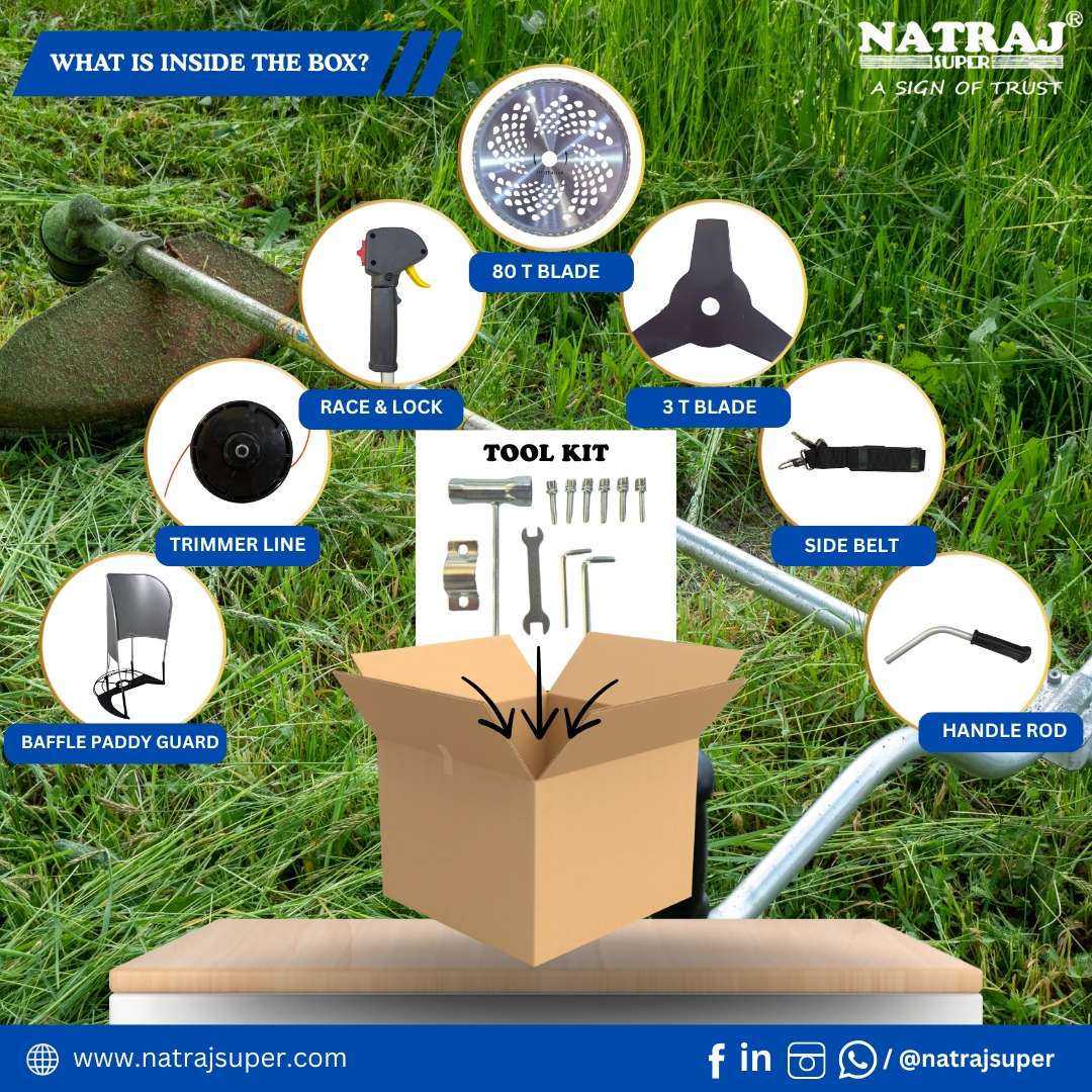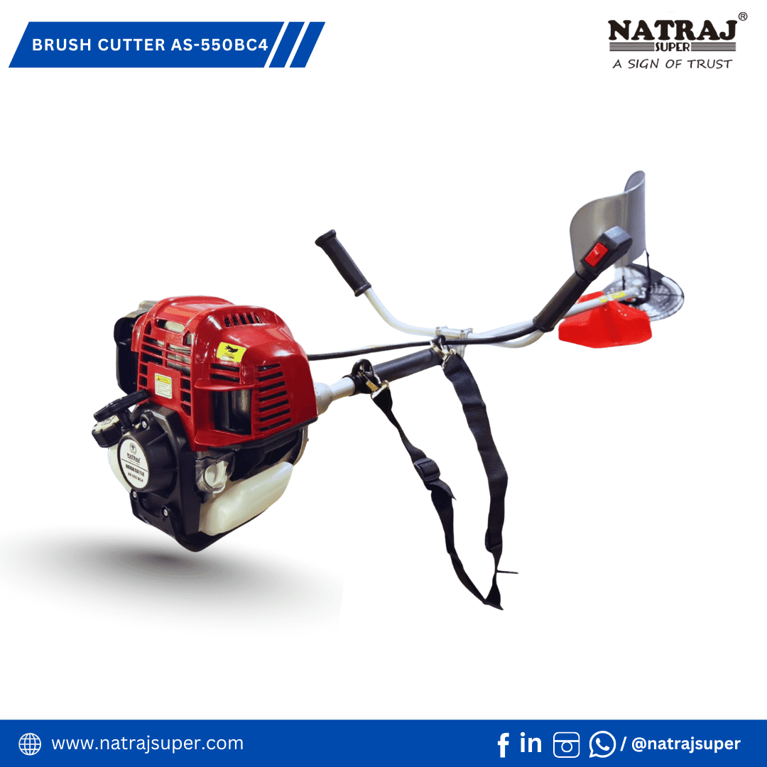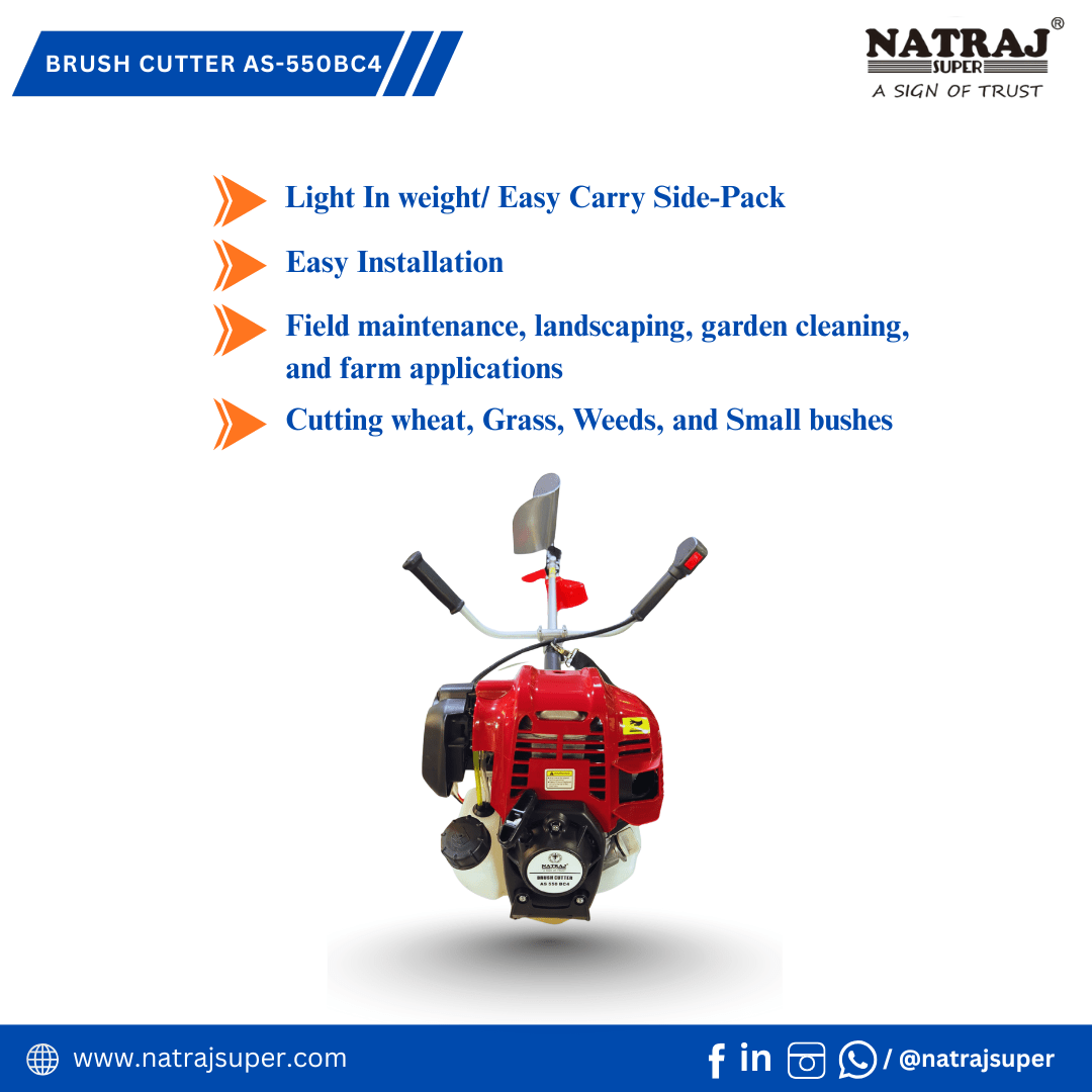 The NATRAJ SUPER AS-550BC4 Brush Cutter is a high-performance agricultural and garden tool designed for effortless grass, weed, and crop cutting. Powered by a 50CC 4-stroke petrol engine, it delivers strong, smooth performance with low fuel consumption and minimal vibration. Its single kick start system ensures quick ignition, while the lightweight side-pack design with an adjustable shoulder and side jacket belt provides superior comfort during long hours of work. The AS-550BC4 comes equipped with multiple attachments — 80 teeth blade, 3-T blade, and nylon tap & go cutter — making it suitable for a wide range of cutting needs. The baffle paddy guard ensures safety during operation, and the complete tool kit and attachments make it ready for immediate use. Durable, fuel-efficient, and easy to handle, the Natraj Super AS-550BC4 is the perfect choice for farmers and professionals who demand power, comfort, and reliability in one machine.