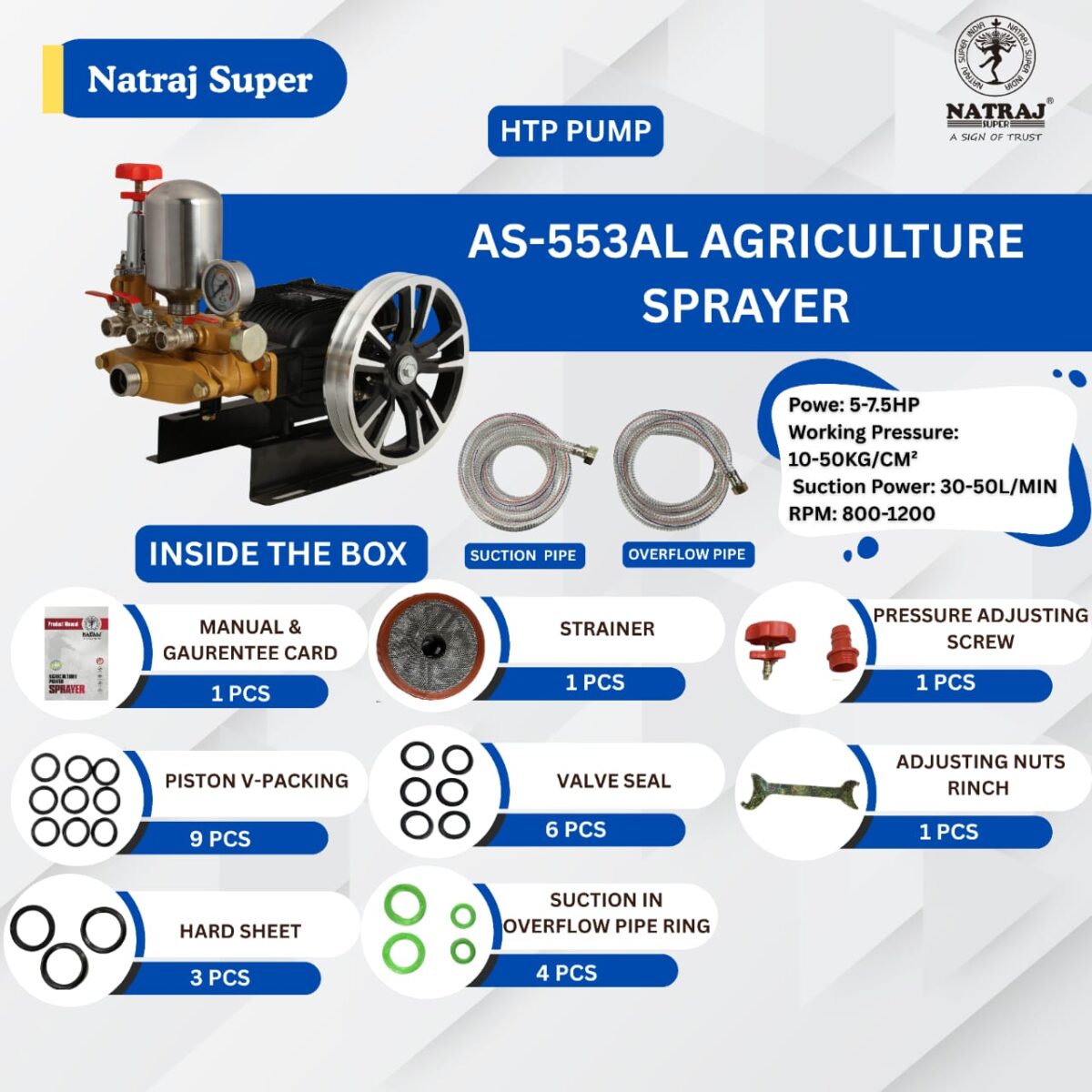 This is Natraj Super Model number AS-553 AL which is compactable with 2 HP MOTOR and this pump is heavy duty with premium quality as Natraj Super is providing “ONE YEAR GUARANTEE & SERVICE WARRANTY” on this model as well. One of the most important thing is, all of the products of Natraj Super is well tested in all circumstances on priority basis.