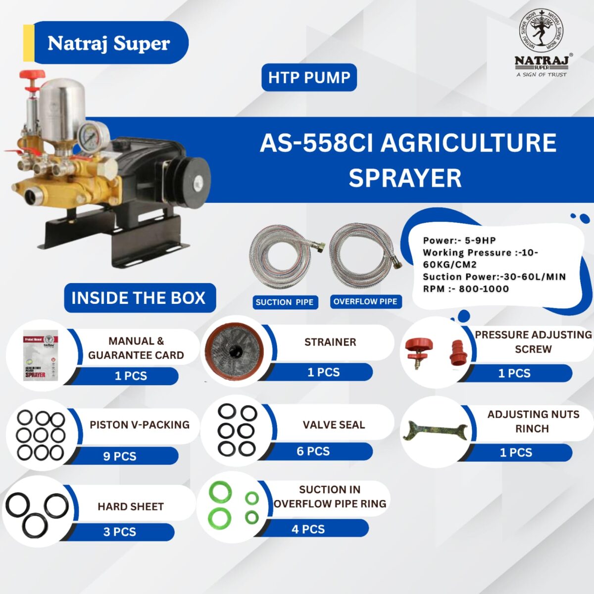 This is Natraj Super Model number AS-558 CI which is compactable with 2 HP MOTOR and this pump is heavy duty with premium quality as Natraj Super is providing “ONE YEAR GUARANTEE & SERVICE WARRANTY” on this model as well. One of the most important thing is, all of the products of Natraj Super is well tested in all circumstances on priority basis.