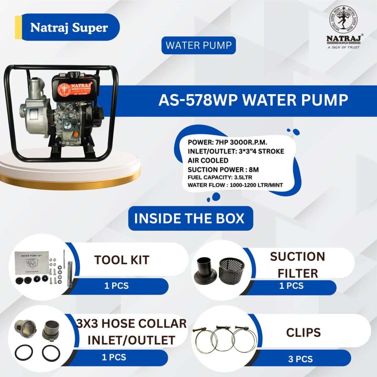This is Natraj Super Model number AS-578WP Diesel WATER PUMP which is 7 HP ENGINE (Diesel) 4 STROKE AIR COOLED and this pump is heavy duty with premium quality as Natraj Super is providing “ONE YEAR SERVICE WARRANTY” on this model as well. One of the most important thing is, all of the products of Natraj Super is well tested in all circumstances on priority basis.