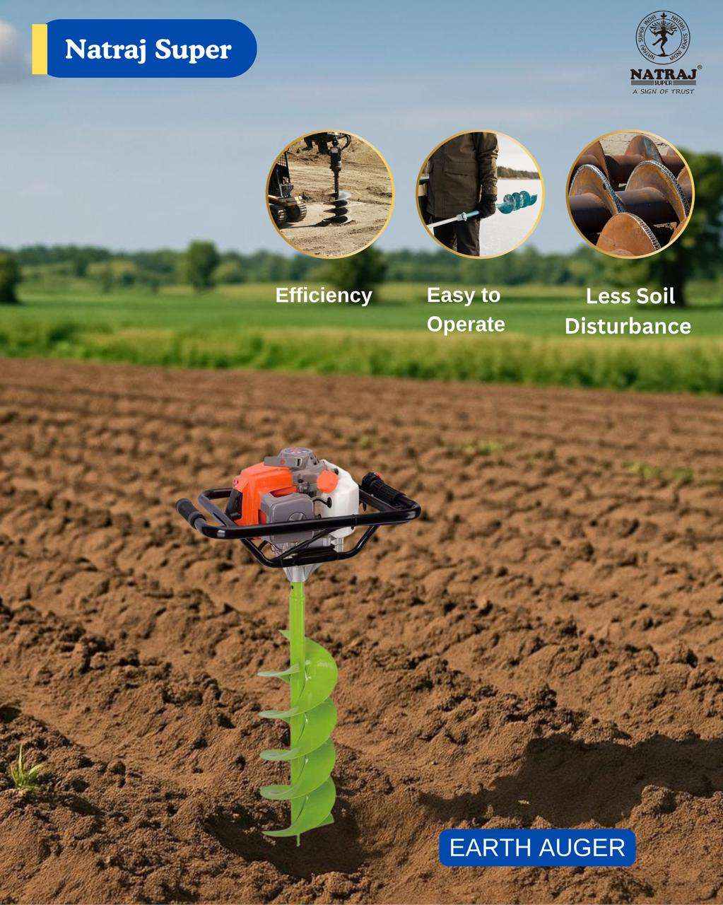 This is Natraj Super Model number Agriculture GASOLINE Earth Auger AS630 which is 63CC 2 Stroke and this very “Light Weight” is heavy duty with premium quality as Natraj Super is providing “Non-Stop Drill” over Soil. One of the most important thing is, all of the products of Natraj Super is well tested in all circumstances on priority basis.