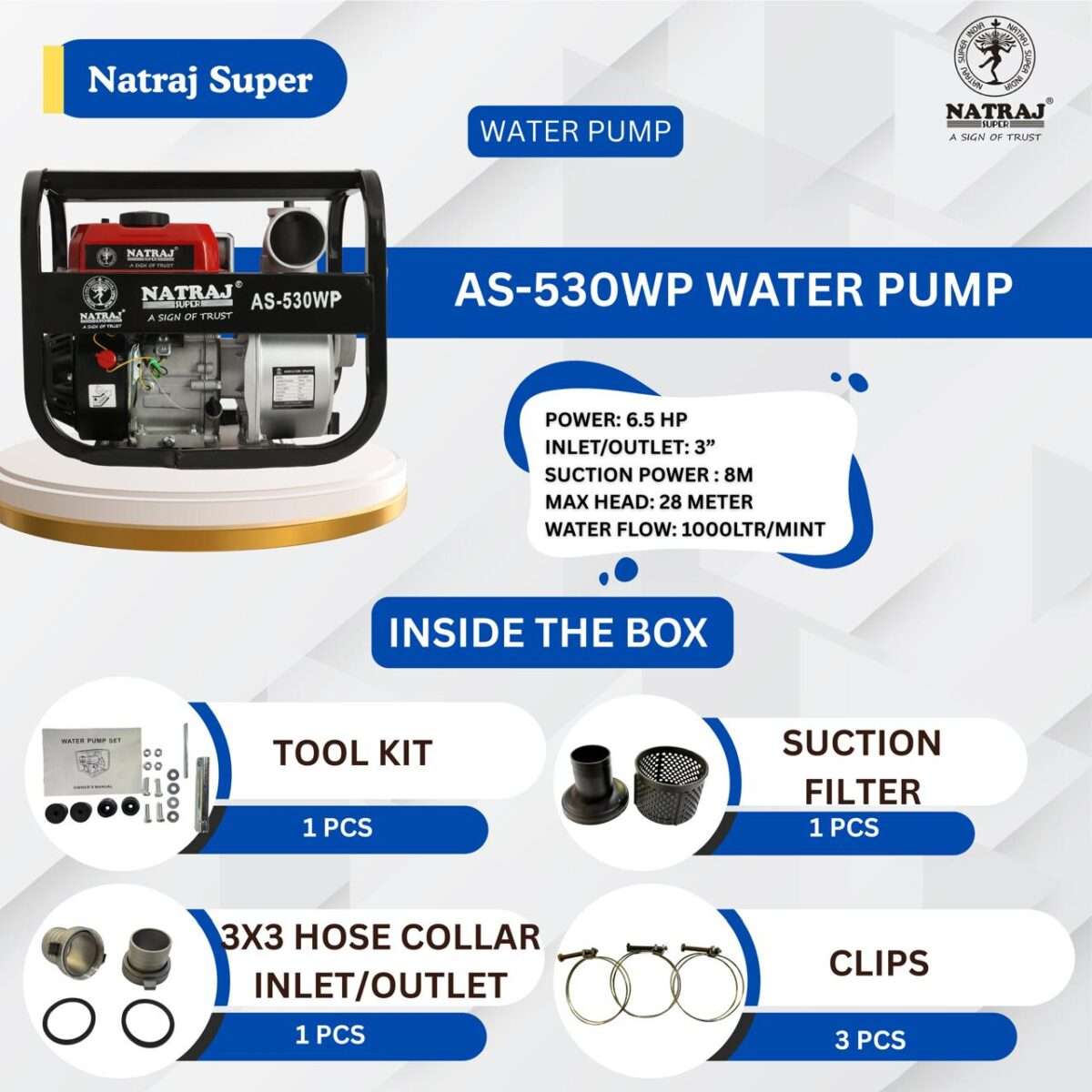 This is Natraj Super Model number AS-530WP WATER PUMP which is 6.5HP ENGINE (PETROL) and this pump is heavy duty with premium quality as Natraj Super is providing “ONE YEAR SERVICE WARRANTY” on this model as well. One of the most important thing is, all of the products of Natraj Super is well tested in all circumstances on priority basis.